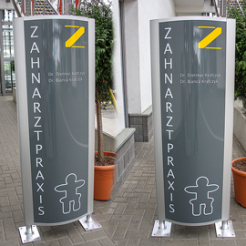 Auch gerade Pylone fertigen wir für Sie. Diese sind in den Maßen 80, 100, 120 oder 150 cm in der Breite und 200, 250, 300, 350 oder 400 cm in der Höhe erhältlich – entweder als Hauben- oder als Scheibenausführung. Wünschen Sie andere Abmessungen, ist das bei LoGo! auch kein Problem – sprechen Sie uns einfach an.
